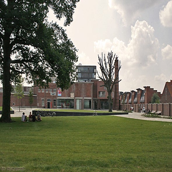 Op de achtergrond het blauwe ketelhuis van de stadsverwarming.